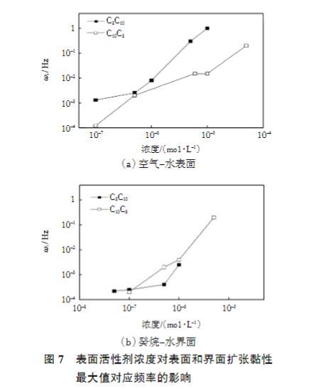 圖7表面活性劑濃度對表面和界面擴張黏性最大值對應(yīng)頻率的影響