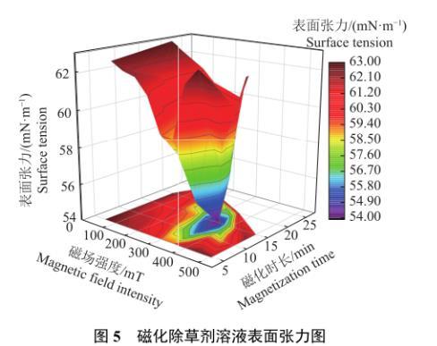 為了直觀地分析磁場強(qiáng)度和磁化時(shí)長2個(gè)因素共同作用對除草劑溶液表面張力的影響規(guī)律,建立以磁場強(qiáng)度和磁化時(shí)長為自變量、以溶液表面張力為因變量的二元函數(shù),使用OriginPro 2018繪制磁場強(qiáng)度和磁化時(shí)長對表面張力影響規(guī)律的空間曲面分布圖(圖5)。由圖5可以看出,磁場強(qiáng)度和磁化時(shí)長對溶液表面張力影響規(guī)律的空間曲面分布圖呈峰值為負(fù)值的高斯空間分布規(guī)律,即空心圓錐面分布,這說明并不是磁場強(qiáng)度越大或者磁化時(shí)間越長,除草劑溶液的表面張力就越小,而是存在處理效果最佳的磁場強(qiáng)度和磁化時(shí)長。磁化除草劑溶液表面張力試驗(yàn)結(jié)果見表2。當(dāng)磁場強(qiáng)度為350 mT、磁化時(shí)長為15.0 min時(shí),除草劑溶液表面張力值最小,為54.0 mN/m,下降14.96%,磁化效果最佳。