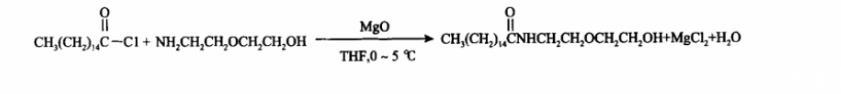 1.2.1棕櫚酸二甘醇酰胺的合成稱取9.10 g二甘醇胺,放入裝有攪拌器、溫度計(jì)和恒壓漏斗的500 mL三口燒瓶中,并加入約70 mL水。通過冰浴將溫度控制在0~5℃范圍內(nèi),加入溶劑210 mL(V(水)∶V(四氫呋喃)=1∶3)及氧化鎂16.80 g(n(氧化鎂)∶n(二甘醇胺)=5∶1)。攪拌約30 min后,稱取22.88 g棕櫚酰氯溶解于70 mL四氫呋喃,轉(zhuǎn)移到恒壓漏斗中,緩慢滴加到三口瓶中,滴加時(shí)間為0.5 h左右,在0~5℃下攪拌反應(yīng)2~2.5 h。反應(yīng)物物質(zhì)的量比為n(棕櫚酰氯)∶n(二甘醇胺)=1∶1.02。反應(yīng)結(jié)束后將反應(yīng)混合物倒入布氏漏斗中抽濾,除去過量的氧化鎂和生成的氯化鎂,收集濾液,旋蒸除去溶劑,最后于55℃下真空干燥12 h,得到目標(biāo)產(chǎn)物,外觀為白色粉末。