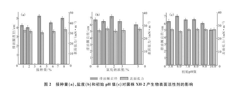 圖2接種量(a)、鹽度(b)和初始pH值(c)對(duì)菌株XH-2產(chǎn)生物表面活性劑的影響