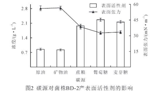 碳源對微生物的生長和次生代謝產(chǎn)物的產(chǎn)生有重要的影響。由圖2可知,不同碳源對菌株BD-2產(chǎn)表面活性劑量的影響不同,本實驗將原油、礦物油作為一類復(fù)雜碳源,葡萄糖、麥芽糖、蔗糖作為簡單碳源,進行對比分析發(fā)現(xiàn),以簡單碳源作為底物時,菌株BD-2產(chǎn)表面活性劑的量顯著高于復(fù)雜碳源(P<0.05),其產(chǎn)表面活性劑量大小依次為葡萄糖>麥芽糖>蔗糖>原油>礦物油。同時以簡單碳源為底物時,菌株BD-2能顯著降低發(fā)酵液表面張力(P<0.05),其發(fā)酵液表面張力大小依次為原油>礦物油>蔗糖>麥芽糖>葡萄糖。在簡單碳源中,以葡萄糖為碳源時,菌株BD-2產(chǎn)生的表面活性劑的量最高,為2.26 g/L,而表面張力最低,為32.7 mN/m。研究結(jié)果表明,簡單碳源有利于菌株BD-2產(chǎn)表面活性劑。因此,選擇葡萄糖為菌株BD-2的碳源。