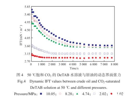 圖4為50℃、飽和CO2的DeTAB水溶液與原油的動(dòng)態(tài)界面張力。由圖4可知,在DeTAB水溶液/CO2/原油體系中,初始階段,油水兩相的動(dòng)態(tài)界面張力下降較快,當(dāng)動(dòng)態(tài)界面張力接近平衡界面張力時(shí),變化趨于平緩,壓力越高界面張力達(dá)到穩(wěn)定所需時(shí)間越長(zhǎng)。在壓力大于4.7 MPa時(shí),界面張力穩(wěn)定所需時(shí)間在4 500 s以上,遠(yuǎn)大于CO2不存在時(shí)所需的穩(wěn)定時(shí)間。原因是表面活性劑水溶液中的CO2通過(guò)緩慢的擴(kuò)散作用溶解到原油中,造成油水兩相動(dòng)態(tài)界面張力不斷變化。
