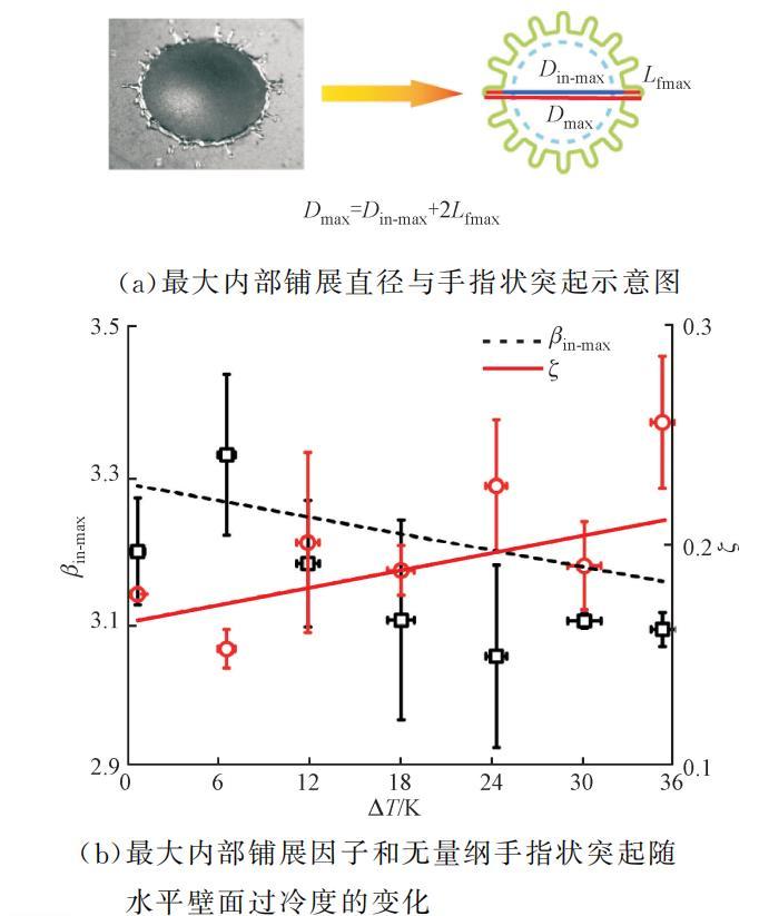 圖7 液滴形狀簡(jiǎn)化與最大內(nèi)部鋪展因子和無量綱手指狀突起隨水平壁面過冷度的變化