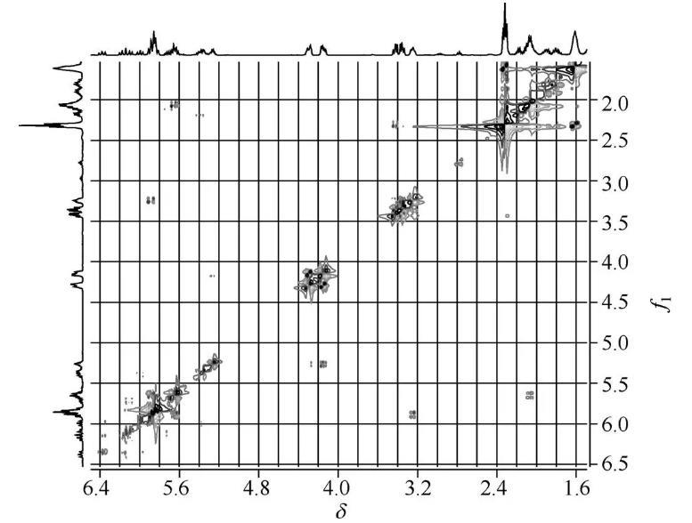 桐油及桐油酸酐的1H NMR見圖2,從圖中可以看出,隨著加成反應(yīng)的進行,桐油中的烯鍵上的氫信號(8~13),TM2烯鍵上的氫信號(11~17)及TM3烯鍵上的氫信號(11~13)明顯減弱,峰型也發(fā)生很大變化。依據(jù)圖2(b)中的各峰積分面積比例確定桐油與兩個馬來酸酐反應(yīng)形成TM2,進一步與馬來酸酐反應(yīng),共軛三烯的氫信號[圖2(b)中14~17]完全消失。由于桐油結(jié)構(gòu)較復(fù)雜,1H NMR歸屬較困難,TM 2經(jīng)1H-1H COSY譜(圖3)分析,從圖3中可以看出,信號3和6相關(guān),為甘油酯緊連的兩個亞甲基氫;6′和8相關(guān),為新生成的六元環(huán)相鄰的兩個氫;5和5′分別與12和12′相關(guān),7和13、13′相關(guān),9和10相關(guān),11和14相關(guān),14和17相關(guān),12、17與15、16相關(guān)。結(jié)合圖2(b)、圖2(c)中信號7、8、9的積分比例分別為1∶2∶2及3∶6∶4,及TM2的1H-1H COSY譜分析,TM2及TM3結(jié)構(gòu)各質(zhì)子信號歸屬如圖2所示。