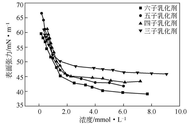 將桐油三酸酐和桐油三酸酐與甲基丙烯酸β羥乙酯反應(yīng)后的產(chǎn)物TM3H1及TM3H2水解,形成羧基官能團數(shù)為4~6的丙烯酸酯改性的桐油基衍生物,TM3H3含有3個羧基。將羧酸改性的桐油用堿等當(dāng)量中和,形成含3~6個羧酸鈉基團的桐油基衍生物,簡稱為3~6子乳化劑。桐油及乳化劑的表面張力測試結(jié)果如圖5所示,與純水(實測表面張力69mN/m)相比,4種多子乳化劑均能降低水的表面張力。表面張力隨其濃度的增加而下降,當(dāng)乳化劑濃度大于2.5mmol時,溶液的表面張力隨濃度的變化趨于平穩(wěn),逐漸接近水平。乳化劑濃度為1.5mmol/L時,3~6子乳化劑表面張力分別為50.2mN/m、48.8mN/m、47.2mN/m和45.2mN/m。