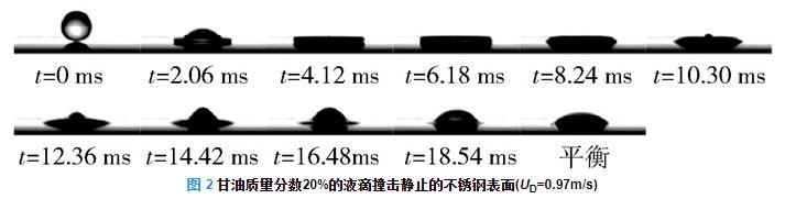 圖2是一個質(zhì)量分數(shù)20%的甘油水溶液液滴撞擊靜止固體表面的典型過程。液滴(D0=2.85mm)以0.97m/s的速度撞擊在不銹鋼表面上(t=0ms),經(jīng)過鋪展達到最大鋪展面積(t=2.06ms),隨后經(jīng)歷回縮、再鋪展以及震蕩的過程(t=4.12~18.54ms),直至達到平衡。