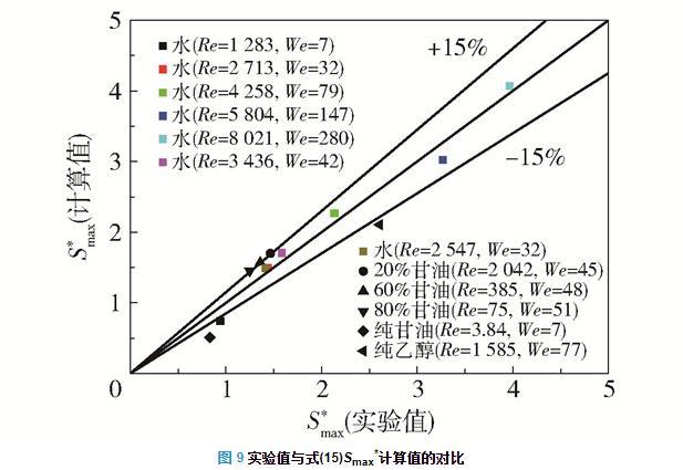 圖9為Smax*實驗值與式(15)的Smax*計算值的對比,式(15)的Smax*計算值與實驗值誤差在大部分情況下都小于15%,因此在75 < Re < 9000,7 < We < 300時,可使用式(15)預(yù)測液滴撞擊不銹鋼固體表面的最大鋪展面積。