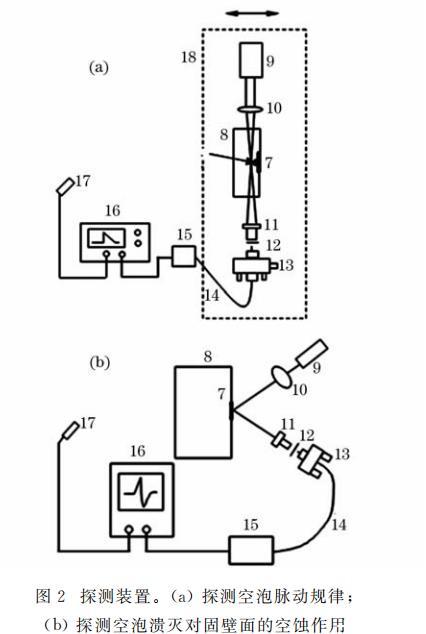 圖2探測裝置。(a)探測空泡脈動(dòng)規(guī)律;(b)探測空泡潰滅對(duì)固壁面的空蝕作用
