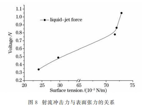 圖8為射流沖擊力隨液體表面張力的變化關(guān)系,從圖可以看出,隨著液體表面張力的增大射流沖擊力也增大;且液體張力越大,靶材受到的射流沖擊強(qiáng)度越大,這是因?yàn)橐后w表面張力加速了空泡的收縮,縮短了空泡潰滅歷時,增加了空泡潰滅速度,所以空泡潰滅時表面張力所起的加速作用也愈大,其所產(chǎn)生的瞬時沖擊力也愈大。因射流沖擊力是造成靶材破壞的主要原因,所以張力較大的液體中空泡能產(chǎn)生較大的空蝕效應(yīng)。