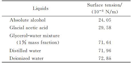 由于本文研究液體張力變化對固壁面近旁空泡生長和潰滅過程的影響,因此所用液體的粘滯系數(shù)μ及密度ρ應(yīng)大體相近,在空氣中的表面張力應(yīng)有較大差異。實(shí)驗(yàn)采用5種液體,其表面張力如表1所示。