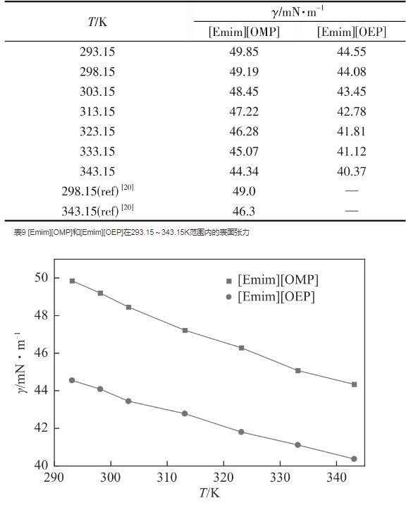 表面張力是一個對自由表面的物理和化學(xué)研究非常重要的性質(zhì),大部分離子液體的表面張力在30~60mN/m之間。[Emim][OMP]和[Emim][OEP]的表面張力實驗值如表9和圖5所示。對于亞磷酸酯離子液體,[Emim][OMP]在某論文中報道的其表面張力數(shù)據(jù)與本文最大偏差值達到了1.96mN/m。分析原因在于不同的課題組使用不同的測量方法測量表面張力,從而使測量實驗值產(chǎn)生較大的偏差。因此,對于表面張力的測定,要達到準確可靠且具有復(fù)現(xiàn)性存在一定難度。