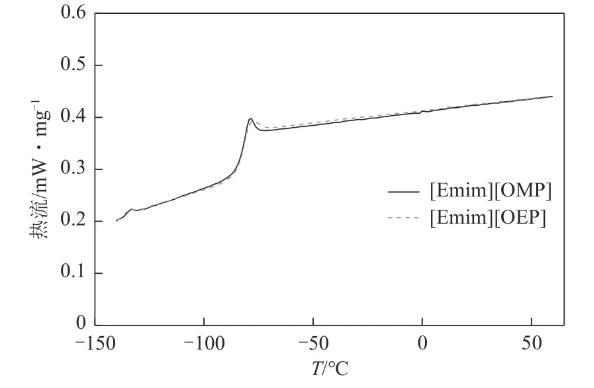 使用差示掃描量熱法對離子液體的固液相變進行了研究(圖4),結(jié)果表明[Emim][OMP]與[Emim][OEP]不存在熔點或凝固點,只有玻璃化轉(zhuǎn)變。[Emim][OMP]和[Emim][OEP]的Tg分別為-84.87℃和-85.00℃,即[Emim][OMP]與[Emim][OEP]并不存在真正意義上的固液相變,而只有冷卻或加熱過程中產(chǎn)生的無定形玻璃態(tài)與液態(tài)之間的轉(zhuǎn)變。