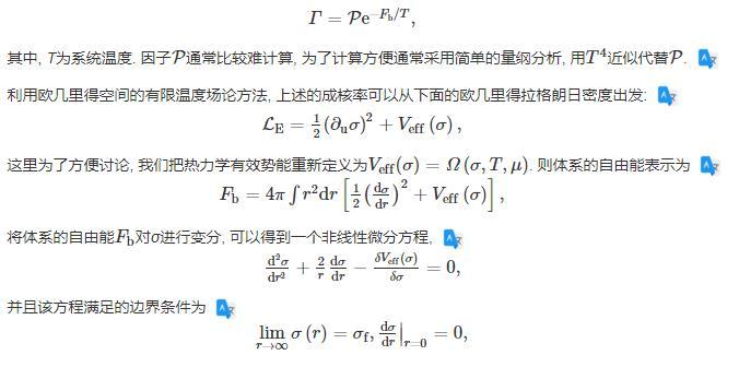 在偽真空的環(huán)境下,大小不一的真真空泡泡,由于量子漲落和熱漲落隨機(jī)出現(xiàn)并消失,直至泡泡的半徑大于等于臨界半徑,然后這些泡泡就會(huì)一直膨脹下去,完成一級(jí)相變的相變過(guò)程,并把多余的體系自由能以相變潛熱的形式釋放到環(huán)境中?;谶@個(gè)機(jī)制,單位時(shí)間單位體積的臨界泡泡成核率可以表示為