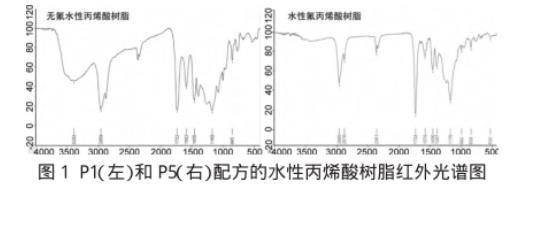 為了表征含氟丙烯酸酯單體是否已經(jīng)有效成為合成樹脂的一份子,我們對P1(不含氟的水性丙烯酸樹脂)和P5(水性氟丙烯酸樹脂)進(jìn)行了紅外光譜分析(圖1)。