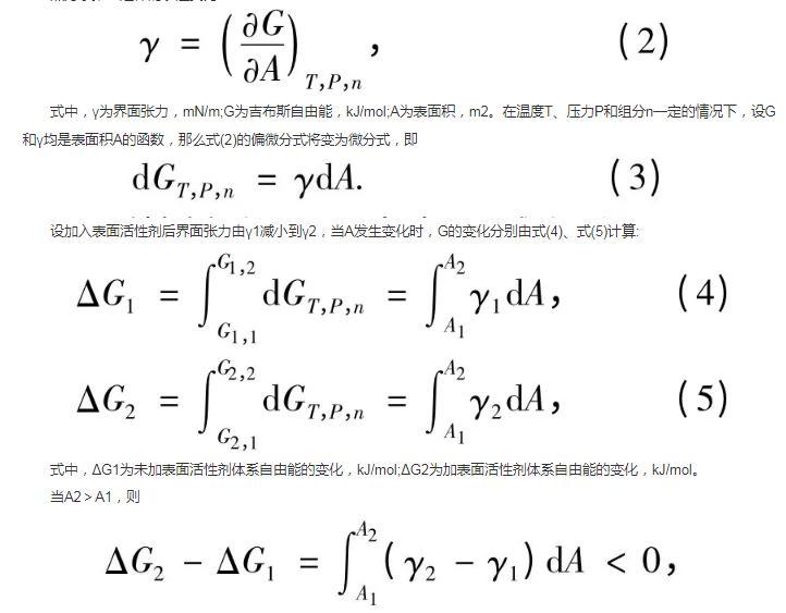 式中,γ為界面張力,mN/m;G為吉布斯自由能,kJ/mol;A為表面積,m2。在溫度T、壓力P和組分n一定的情況下,設(shè)G和γ均是表面積A的函數(shù),那么式(2)的偏微分式將變?yōu)槲⒎质?,?
