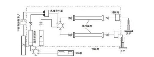 在油藏條件下,CO2一般處于超臨界狀態(tài)(31.26℃,7.38 MPa以上),超臨界CO2密度接近液體,與水溶液形成的分散體系稱為乳液更為合適,驅(qū)油過程中將超臨界CO2和表面活性劑水溶液形成超臨界CO2乳液是控制CO2流度的有效方法,能夠大幅改善CO2驅(qū)油效果。在超臨界CO2乳液驅(qū)替過程中,CO2乳液的界面特性會直接影響其穩(wěn)定性,從而影響CO2乳液在驅(qū)替過程中的封堵效果。目前,對CO2乳液的研究主要集中在反相微乳萃取分離、酶催化和納米材料制備等方面。筆者通過實驗研究不同溫度、壓力條件下CO2乳液界面特性及其封堵效果。