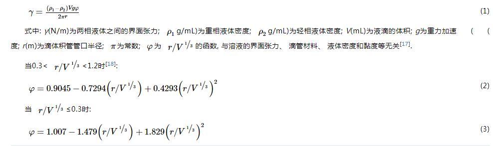 式中:γ(N/m)為兩相液體之間的界面張力;ρ1(g/mL)為重相液體密度;ρ2(g/mL)為輕相液體密度;V(mL)為液滴的體積;g為重力加速度;r(m)為滴體積管管口半徑;π為常數(shù);φ為r/V1/3的函數(shù),與溶液的界面張力、滴管材料、液體密度和黏度等無(wú)關(guān)。