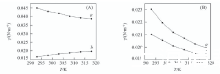溶有萃取劑時(shí),不同稀釋劑體系中界面張力隨溫度升高的變化趨勢(shì)明顯不同(見圖7)。首先,萃取劑的存在會(huì)使體系的界面張力明顯降低;其次,萃取劑/脂肪烴正辛烷體系的界面張力隨著溫度的升高緩慢上升;而萃取劑/芳香烴苯體系的界面張力隨著溫度的升高逐漸下降。稀釋劑種類不同時(shí),界面張力隨溫度的變化趨勢(shì)明顯不同,反映了界面層結(jié)構(gòu)受溫度影響的不同。通常情況下,加入萃取劑后,隨著溫度升高TODGA分子在界面上與水分子的結(jié)合力降低,導(dǎo)致其聚集濃度下降;同時(shí),溫度的升高對(duì)TODGA分子在界面上的締合有影響,導(dǎo)致其締合狀態(tài)不穩(wěn)定,降低其聚集濃度。這兩者均導(dǎo)致界面張力隨著溫度的升高而增大,并且大于溫度升高熱運(yùn)動(dòng)對(duì)界面分子間作用力的影響;對(duì)于芳香烴稀釋劑體系來說還存在另一個(gè)重要影響因素,即苯環(huán)上π鍵的存在。隨著溫度的升高,苯環(huán)上π鍵與界面萃取劑分子上極性基團(tuán)間的相互作用被破壞,使TODGA活度增大,進(jìn)而增大了TODGA在界面上的聚集濃度,使得界面張力降低。相比較而言,芳香烴作稀釋劑時(shí)溫度升高對(duì)苯環(huán)上π鍵與萃取劑分子間相互作用的影響明顯大于其對(duì)前兩者的作用。