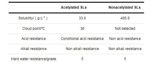 2種SLs產(chǎn)品的同系物組分存在較大差異,具體體現(xiàn)在親水基的乙?;潭?,疏水基的碳鏈長(zhǎng)度和分子的類型上。乙?;疭Ls產(chǎn)品主要為雙乙?;瘍?nèi)酯型的槐糖脂;去乙?;疭Ls產(chǎn)品的同系物組分為親水的去乙?;滴餅橹?,內(nèi)酯型、酸型和bola型各占26.99%、49.98%和23.03%。乙?;疭Ls具有比去乙?;疭Ls更好的表面性能,能以更小濃度形成膠束,并且臨界表面張力更小,同時(shí)還具有較低的HLB值,親脂性更強(qiáng)。去乙?;疭Ls的水溶性是前者的14倍以上,達(dá)到了485.8 g/L;HLB值為13,親水性更強(qiáng);泡沫性能和乳化能力均優(yōu)于前者。這些性質(zhì)的差異彌補(bǔ)了野生型菌株生產(chǎn)的SLs在生物刺激性較高、水溶性和泡沫性較低等方面的不足,為生物表面活性劑家族增添了新成員,去乙?;疭Ls在美妝護(hù)膚品、洗滌劑、增溶劑、農(nóng)藥、三次采油和溢油處理等水基精細(xì)化工和工農(nóng)生產(chǎn)領(lǐng)域具有應(yīng)用潛力。乙酰化SLs和去乙?;疭Ls的組分結(jié)構(gòu)和性能具有顯著的差異,在實(shí)際應(yīng)用中存在互補(bǔ)的可能性。比如,乙?;疭Ls和去乙酰化SLs產(chǎn)品在合適的復(fù)配條件下可能同時(shí)具有良好的水溶性和表面性能,或者兼具良好的親油性和泡沫性能,或者以特定HLB值復(fù)配后能夠高效地洗滌某種疏水物。這些結(jié)構(gòu)和性質(zhì)的差異所表現(xiàn)出的協(xié)同性將拓展槐糖脂生物表面活性劑的應(yīng)用領(lǐng)域,并為其提供更多的選擇方案。