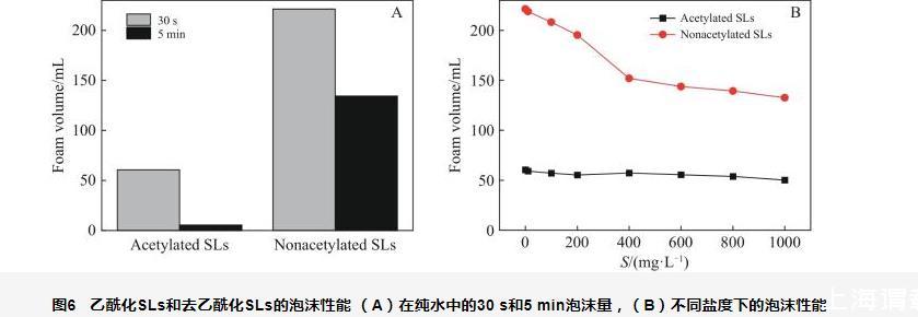 圖6乙酰化SLs和去乙?;疭Ls的泡沫性能(A)在純水中的30 s和5 min泡沫量,(B)不同鹽度下的泡沫性能