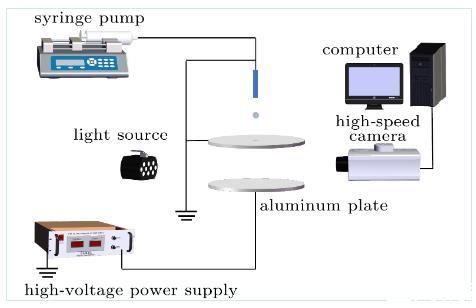 在本實(shí)驗(yàn)中,將兩塊直徑為10cm的圓形鋁板沿著垂直方向放置,其間隔固定為20mm。在上極板中心位置開一個直徑為5mm的孔口,以便液滴從上極板上方滴落,穿過上極板與下極板發(fā)生撞擊行為。為了實(shí)現(xiàn)垂直電場的形成,將高壓直流電源與下極板相連,上極板作接地處理,這樣的結(jié)構(gòu)產(chǎn)生了一個垂直電場和一個帶電的基底。此外,不銹鋼針管(G24,外徑0.55m,內(nèi)徑0.27mm)通過毛細(xì)管連接到微流注射泵上,使液滴以恒定的撞擊速度滴落到下極板。為了消除靜電對實(shí)驗(yàn)的影響,將針管作接地處理,確保液滴在進(jìn)入電場之前不攜帶任何感應(yīng)電荷。