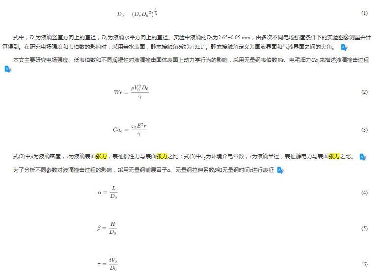 本文主要研究電場強(qiáng)度、低韋伯?dāng)?shù)和不同潤濕性對液滴撞擊固體表面上動力學(xué)行為的影響,采用無量綱韋伯?dāng)?shù)We、電毛細(xì)力Cae來描述液滴撞擊過程
