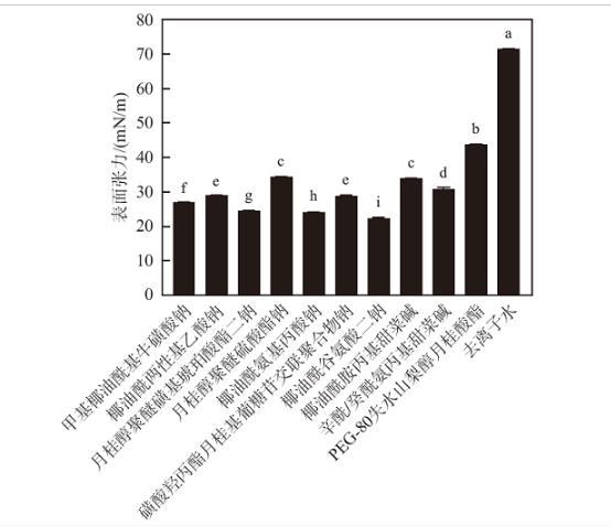 將10種表面活性劑的去離子水溶液(pH=6.0)進行表面張力測定,結(jié)果如圖1所示。去離子水的表面張力為71.81 mN/m;所有表面活性劑均可顯著降低去離子水的表面張力,其中PEG-80失水山梨醇月桂酸酯降低表面張力的能力最差,為43.73 mN/m;月桂醇聚醚硫酸酯鈉和椰油酰胺丙基甜菜堿水溶液的表面張力無顯著差異,分別為34.14和33.87 mN/m;辛酰/癸酰氨丙基甜菜堿水溶液的表面張力為30.54 mN/m;椰油酰兩性基乙酸鈉和磺酸羥丙酯月桂基葡糖苷交聯(lián)聚合物鈉水溶液的表面張力無顯著差異,分別為28.88和28.71 mN/m;甲基椰油酰基?;撬徕c水溶液的表面張力為26.74 mN/m;月桂醇聚醚磺基琥珀酸酯二鈉水溶液的表面張力為24.16 mN/m;椰油酰氨基丙酸鈉水溶液的表面張力較低,為23.84 mN/m;椰油酰谷氨酸二鈉水溶液的表面張力最低,為22.08 mN/m。