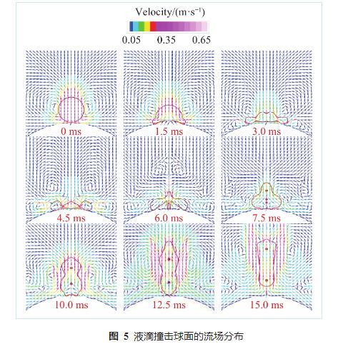 從圖中可以看出,0 ms時(shí),液滴開(kāi)始接觸壁面,液滴主要在慣性力作用下沿球表面快速鋪展,受球面形狀的影響,重力對(duì)液滴的鋪展起到一定作用,液滴通過(guò)克服黏性損失和液滴變形將動(dòng)能轉(zhuǎn)化為表面能;1.5 ms時(shí),由于蒸汽積壓,液滴底部呈扁平狀,此時(shí)氣膜較薄,底部球面上存在熱流密度明顯較大的環(huán)狀區(qū)域,同時(shí)液滴運(yùn)動(dòng)方向由軸向開(kāi)始轉(zhuǎn)變?yōu)閺较颍?.0 ms時(shí),隨著液滴繼續(xù)鋪展,流體向液滴前端積聚,徑向速度與壓力都開(kāi)始減小,同時(shí),液滴下方蒸汽流出后,周圍空氣沿球面流向液滴底部,形成回流;4.5 ms時(shí),液滴達(dá)到最大鋪展,隨后,在表面張力的作用下開(kāi)始收縮,外部環(huán)狀區(qū)域壓力與速度都較小,中心點(diǎn)處氣膜較薄,具有較高的熱流密度,同時(shí),因?yàn)橐旱涡纬闪酥虚g低四周高的結(jié)構(gòu),周圍氣流形成多個(gè)渦流;6.0 ms時(shí),液滴逐漸收縮,外側(cè)速度與壓力明顯小于中心內(nèi)部,且液滴運(yùn)動(dòng)方向由原來(lái)的周向變?yōu)檩S向,中心區(qū)域與外側(cè)氣膜厚度都較薄,且中心區(qū)域更薄,因此熱流密度更大,多個(gè)渦流都在遠(yuǎn)離液滴;7.5 ms時(shí),液滴進(jìn)一步收縮,外側(cè)速度與壓力都在升高,軸向方向速度減弱,由于液滴底部氣膜厚度不均勻,導(dǎo)致球面熱流密度分布呈多環(huán)形,不同區(qū)域差異較大,同時(shí),因?yàn)橐旱蔚撞繅毫^高,對(duì)底部氣膜擠壓作用較強(qiáng),使氣流逸散速度進(jìn)一步提高;9.0 ms-13.0 ms階段,液滴逐漸脫離壁面,壁面熱流密度隨之減小,直到液滴完全脫離壁面,周圍氣流在液滴的帶動(dòng)下逐漸沿軸向遠(yuǎn)離球面,壁面附近氣流速度逐漸減小。
