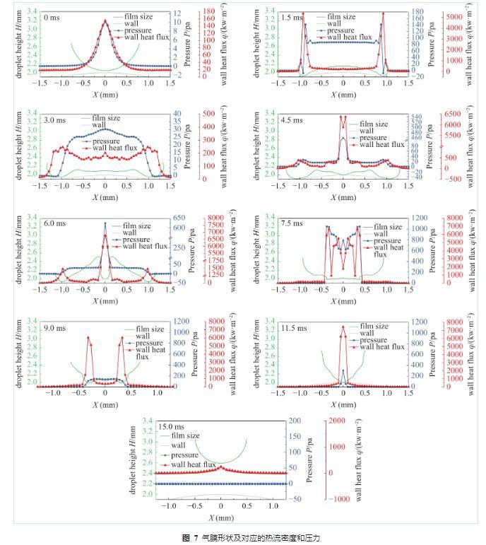 圖7展示了不同球面位置處氣膜厚度、壁面壓力及熱流密度,從圖中可以看出壁面熱流密度及壓力與氣膜厚度的對(duì)應(yīng)關(guān)系。當(dāng)t=0.0 ms時(shí),液滴即將撞擊球面,此時(shí)中心點(diǎn)氣膜厚度最薄,對(duì)應(yīng)的壁面位置壓力與熱流密度都高于其它位置;t=1.5 ms時(shí),液滴向四周鋪展,在距液滴中心大約1 mm處氣膜厚度達(dá)到最低,可以看出熱流密度與壓力都在此處發(fā)生驟增,在距離液滴中心更近的位置又因氣膜厚度增大而驟減,顯然壓力與熱流密度都與氣膜厚度成反比;t=3.0 ms時(shí),液滴繼續(xù)鋪展,邊緣處氣膜厚度升高,熱流密度與壓力都在降低,而邊緣至中心位置氣膜厚度降低,熱流密度略有升高,但氣膜厚度波動(dòng)較大,因此熱流密度與壓力也出現(xiàn)了不同程度的波動(dòng);t=4.5 ms時(shí),液滴鋪展達(dá)到最大,中心位置與邊緣處氣膜厚度都在減小,中心位置氣膜厚度更小,此處熱流密度與壓力增幅更大;t=6.0 ms時(shí),液滴開(kāi)始彈跳,中心及邊緣處所受壓力增加;t=7.5 ms時(shí),中心位置氣膜厚度較低且波動(dòng)較大,因此中心位置壓力及熱流密度都發(fā)生了振蕩,變化幅度較大;t=9.0 ms-15.0 ms時(shí)段,液滴逐漸脫離熱壁面,氣膜厚度發(fā)生變化,壓力與熱流也隨之變化,直到液滴脫離壁面。
