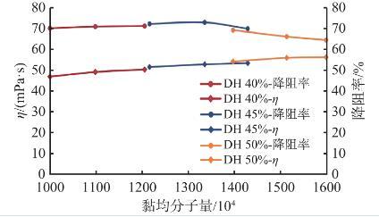 室內通過控制水解度(40%~50%)制備了一系列的SRY-1樣品,配制成濃度為0.5%的溶液,測試聚合物不同分子量下的表觀黏度(30 min)和降阻率(Q=45 L/min)。如圖2所示,在優(yōu)化的水解度范圍內,SRY-1分子量均在1000萬以上,水解度越高,分子量越高;溶液表觀黏度隨分子量的增大而增大,但降阻率隨分子量的增大呈現(xiàn)先緩慢升高后較快降低的趨勢。主要是因為分子量越高,重復單元數(shù)愈多,分子間越易形成鏈纏結,分子鏈具有更大的流體力學體積,溶液黏度增大,當增大到一定范圍,溶液黏彈性受到影響,降阻率就隨之下降。由數(shù)據(jù)對比,SRY-1分子量控制在1200~1300萬為宜。