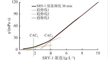 據(jù)研究表明,締合聚合物溶脹經(jīng)歷3個階段,分別對應了兩個黏度突變的點,即臨界締合濃度CAC;通過繪制聚合物溶液黏度-濃度曲線,擬合分析得到3個階段的趨勢線及公式,兩兩相交的點取絕對值即為臨界締合濃度值,計算得CAC1,CAC2,如圖3所示。根據(jù)曲線可以看出,在CAC1之前,溶液黏度增長趨勢較緩慢,當達到CAC1并向CAC2過渡時,溶液黏度增長相對加快,超過CAC2后,溶液黏度迅速增加,1.0%用量下終黏可達110 mPa·s以上。