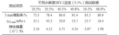 數(shù)據(jù)顯示,隨水解度增大,SRY-1增黏率和表觀黏度都顯著提高,但水解度超過60%后,增黏率又有所降低,SRY-1溶液G'呈現(xiàn)先增大后減小的趨勢。分析認為:在一定范圍內,由于水解度增大,分子鏈更加伸展,分子間共價鍵作用更易形成彈性微觀網(wǎng)絡結構,彈性模量G'增大;隨著水解度繼續(xù)增大,聚合物分子流體力學體積持續(xù)增大而很難交叉纏繞,黏性行為明顯,彈性減弱,表現(xiàn)為彈性模量G'減小。因此水解度過度提高會造成增黏率下降,溶液黏性增強,彈性降低的負面影響。由數(shù)據(jù)可知,SRY-1水解度為40%~50%時,SRY-1的3 min增黏率可達90%以上,溶液黏彈性最為顯著。