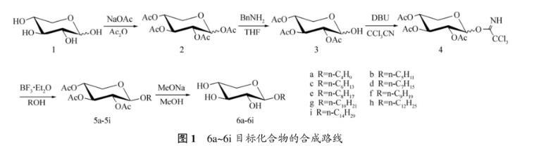采用全乙?;哪咎?2)在四氯化錫催化下與一系列脂肪醇發(fā)生偶聯(lián)反應(yīng),對(duì)時(shí)間要嚴(yán)格控制,否則有部分轉(zhuǎn)化成α-異構(gòu)體,當(dāng)時(shí)間過長(zhǎng)時(shí),還會(huì)形成以α-糖苷為主的產(chǎn)物和少量2-位脫保護(hù)的糖苷副產(chǎn)物。參考烷基-β-D-葡萄糖苷等合成與性能研究成果,按照Scheme1所示的路線,以D-木糖(1)為原料通過乙?;?、脫1-位乙酰基、與三氯乙腈反應(yīng),得到相應(yīng)的三氯乙酰亞胺酯(4)。采用易于構(gòu)筑1,2-反式糖苷鍵的三氯乙酰亞胺酯法,以三氟化硼乙醚作糖苷化偶聯(lián)反應(yīng)的催化劑,使得具有鄰基參與效應(yīng)的三氯乙酰亞胺酯(4)與相應(yīng)的脂肪醇反應(yīng)及相應(yīng)的脫乙?;Wo(hù),合成一系列烷基-β-D-吡喃木糖苷,如圖1所示。本文作者對(duì)其溶解性、表面張力、乳化性能、液晶性能、熱穩(wěn)定性等理化性質(zhì)進(jìn)行研究。