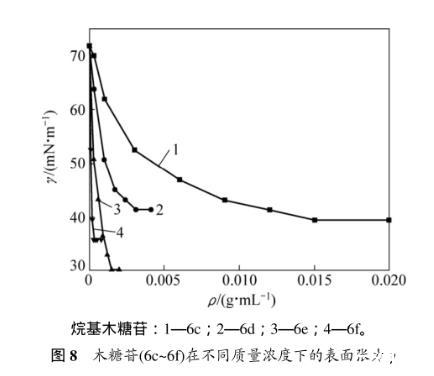 烷基-β-D-吡喃木糖苷的表面活性可以用其溶液降低表面張力的能力或效率來衡量,前者用表面活性劑使溶劑表面張力降低程度來衡量,后者用使表面張力降至一定值時(shí)所需要的表面活性劑質(zhì)量分?jǐn)?shù)來衡量。通過上述乳化性能和起泡性能測試結(jié)果可以看出:木糖苷6a,6b的表面活性較差,糖苷6c~6f具有良好的表面活性。本文采用最大泡壓法,在25℃下,測定并計(jì)算出不同質(zhì)量分?jǐn)?shù)下烷基-β-D-吡喃木糖苷6c~6f所對應(yīng)的表面張力。從圖8可以得出:1)幾種烷基-β-D-吡喃木糖苷(6c~6f)添加到水中明顯地降低了水的表面張力,呈現(xiàn)出兩親結(jié)構(gòu)特征的木糖苷分子固有的表面活性;2)在所測的質(zhì)量分?jǐn)?shù)范圍內(nèi),烷基木糖苷(6c~6f)表面張力都有隨質(zhì)量分?jǐn)?shù)增大先急劇下降而后又緩慢下降,最后基本不變的趨勢;3)不同的木糖苷6c~6f臨界質(zhì)量分?jǐn)?shù)(CMC)不同。