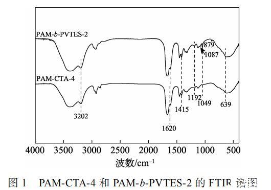 圖1為聚合物的FTIR譜圖。由圖1可知,對于PAM-CTA-4,3202 cm–1處為—NH2的伸縮振動吸收峰,1620 cm–1處為C==O鍵的伸縮振動吸收峰,1192 cm–1處的吸收峰為C—S鍵的伸縮振動,1049 cm–1處的吸收峰為C==S鍵的伸縮振動,1415 cm–1處的吸收峰歸屬于苯環(huán)骨架的伸縮振動,639 cm–1處的吸收峰為苯環(huán)上單取代的特征峰,表明聚合物PAM-CTA-4已經(jīng)成功制備。在PAM-b-PVTES-2的FTIR譜圖中,879 cm–1處為Si—C鍵的伸縮振動吸收峰,1087 cm–1處為Si—O鍵的伸縮振動吸收峰,表明聚合物已成功制備。