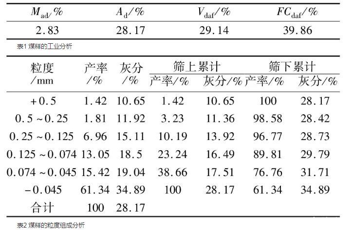 由表1、2可知,該煤樣水分為2.83%,灰分為28.17%,揮發(fā)分為29.14%,固定碳含量為39.86%。-0.045 mm粒級以下的煤泥產(chǎn)率為61.34%,灰分為34.89%,說明該煤樣中細粒煤占比大且灰分較高,煤樣為高灰細粒難浮煤泥。