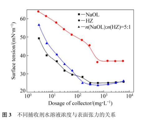 表面張力是影響浮選過程中氣泡的穩(wěn)定性,以及氣泡形成難易程度的主要參考數據,臨界膠團濃度(簡稱CMC)是反映表面活性劑降低水溶液表面張力的效率。組合用藥的浮選效果優(yōu)于單一用藥,這可能與其在水溶液中的表面張力有一定的關系。圖3所示為最佳pH條件下(pH=9.0)組合捕收劑與兩種單一捕收劑的水溶液濃度與表面張力的關系。NaOL在水中微量的添加顯著地降低了水的表面張力,而隨著NaOL濃度的增加,溶液的表面張力逐漸下降,在濃度為302 mg/L時溶液的表面張力達到最低,為22.7~24.8 mN/m。此后NaOL濃度的增加并不能顯著地降低水的表面張力,所以可以確定NaOL的CMC值約為302 mg/L,與文獻中報道的1.03×10?3mol/L(308 mg/L)接近。而HZ的CMC值568 mg/L,表面張力36.37 mN/L。作為一種表面活性劑,其表面活性明顯不如NaOL,在較高濃度下,HZ才能形成膠團。浮選HZ用量為200 mg/L,低于其CMC值,在此濃度下,膠團未形成,表面張力較高,起泡性不佳,在單礦物浮選試驗中表現(xiàn)出了泡沫量小的特點。組合捕收劑水溶液的表面張力測試結果表明,CMC值約為150 mg/L,CMC值下水溶液表面張力為24.88 mN/m??梢奌Z的添加能降低NaOL的CMC值,這可能是NaOL作為一種陰離子型表面活性劑,親水“離子頭”之間的靜電作用較強,非離子表面活性劑的“插入”到親水“離子頭”之間,同時亞氨基也存在一定程度的解離,使得離子之間的靜電斥力減小。