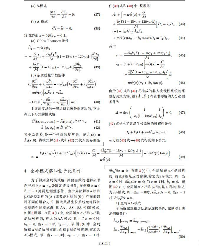 將系統(tǒng)方程以振幅遠(yuǎn)小于1進(jìn)行線性化處理,結(jié)合(1)式—(4)式,可以得到共晶生長(zhǎng)系統(tǒng)的擾動(dòng)態(tài)滿足以下控制方程和邊界條件: