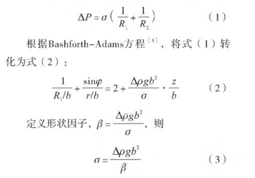 座滴法是基于熔體(液體)在水平托板表面形成穩(wěn)定橢球液滴的形狀參數(shù)測(cè)量表面張力的方法[6]?;谧畏y(cè)量玻璃熔體表面張力,玻璃熔體在水平托板上受重力和表面張力共同作用形成旋轉(zhuǎn)軸對(duì)稱橢球[7](圖1),橢球表面任一點(diǎn)的壓力差與表面張力之間的數(shù)學(xué)關(guān)系見(jiàn)式(1):