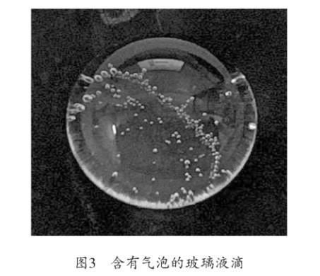 玻璃試樣要保證化學組成的均勻性,且內(nèi)部不能包含缺陷(氣泡、結(jié)石和條紋等)。如有氣泡會導致玻璃熔體體積失真,如圖3所示。氣泡中的氣體受熱會進一步膨脹,使玻璃液滴體積增大,導致玻璃液滴在測試溫度下的密度偏低,最終影響玻璃熔體表面張力的測試結(jié)果。玻璃條紋和結(jié)石等缺陷也是玻璃成分不均的表現(xiàn),在受熱條件下影響玻璃熔體液滴形態(tài),導致無法獲得中心旋轉(zhuǎn)軸對稱的玻璃液滴,因此應選擇無內(nèi)在質(zhì)量缺陷的玻璃。