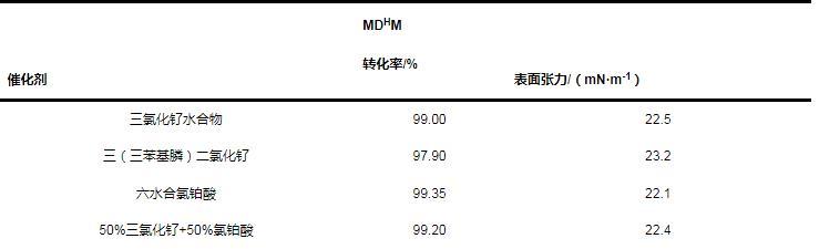 分別以三氯化釕、三(三苯基膦)二氯化釕、六水合氯鉑酸和50%三氯化釕+50%氯鉑酸為催化劑,在以下條件下合成BEOTSS:催化劑用量30 mg/kg(以Ru或Pt質(zhì)量計),n(BEO)∶n(MDHM)=1.05∶1,反應時間6.0 h,反應溫度100℃。測定MDHM轉(zhuǎn)化率以及0.1%BEOTSS水溶液的表面張力,結(jié)果如表1所示。可以看出,這幾種催化劑的效果均較好,MDHM轉(zhuǎn)化率在97%以上,表面張力低于24 mN/m。其中,三氯化釕的催化效果與傳統(tǒng)的氯鉑酸相差不大,只是所得產(chǎn)物為黃色液體,比氯鉑酸的產(chǎn)物顏色深??紤]到三氯化釕價格比氯鉑酸便宜很多,因此采用三氯化釕作為催化劑具有很好的成本優(yōu)勢。