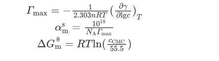 式中:γ為表面張力,mN/m;c為表面活性劑的濃度,mol/L;T為溫度,298 K;R為摩爾氣體常數(shù),8.314 J/(mol·K);n為與表面活性劑性質(zhì)相關的參數(shù),對于本文研究的非離子表面活性劑,n=1;N A為阿伏加德羅常數(shù);c CMC為臨界膠束濃度,mol/L。