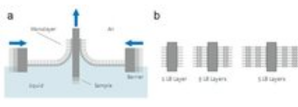 位于氣-液或液-液界面處不可溶的功能性分子、納米顆粒、納米線或微粒所形成的單分子層可定義為Langmuir膜。這些分子能夠在界面處自由移動,具有較強(qiáng)的流動性,易于控制其堆積密度,研究單分子層的行為。將材料沉積在淺池(稱頂槽)中的水亞相上,可以得到Langmuir膜。在滑障的作用下,單分子層可以被壓縮。表面壓力即堆積密度可以通過Langmuir膜分析儀的壓力傳感器進(jìn)行控制 。