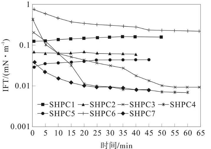 將SHPC1~7活性體系溶液配制為濃度大小為0.25%的溶液,密閉24 h,然后利用Texas-500C界面張力儀對界面張力進行動態(tài)測定,從而得到圖2所示的結果。