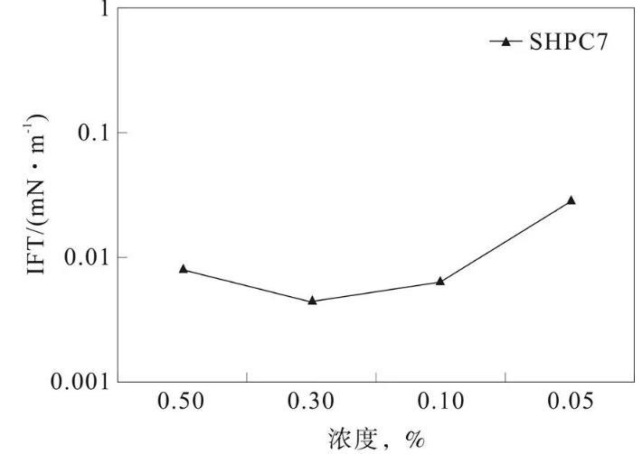 通過上述的圖可以看出,當SHPC7濃度在0.05%的時候,此時的界面張力最差,油水界面張力保持在10-2mN/m的數(shù)量級。而當濃度在0.3%的時候,此時的油水界面張力在10-3mN/m的數(shù)量級。由此可以看出,當SHPC7的濃度在0.3%的時候,其界面張力最小,滿足試驗油田樣品的驅油需求。