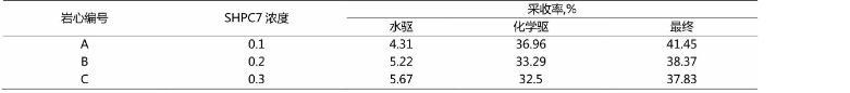 由此,通過表2看出,在增大SHPC7表明活性劑的濃度下,其驅油效果在不斷增加。但是在0.3%的濃度下其驅油采收率小于濃度為0.2%的采收率。根據(jù)上述的結果得出,在實際的應用中,應選擇SHPC7表明活性劑濃度大小為0.2%的濃度,此時采收率最高。