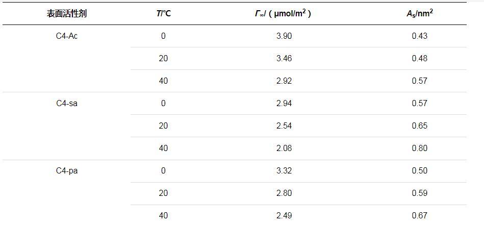 通常較高的Γ∞和較低的AS值表明表面活性劑分子密集地排列在空氣與水的界面上,由上述公式計算得到三種表面活性劑的?!藓洼^低的AS值如表2所示。對比參數(shù)可知,同種表面活性劑的?!蘧S溫度的升高而減小,AS有所增大,吸附表面的分子排布較為松散。這是由于溫度較高的情況下表面活性劑分子熱運動加劇,更易從吸附界面上脫離,并且因無規(guī)則運動導(dǎo)致吸附分子所占面積增大了。溫度升高導(dǎo)致溶解度的增加,因而表面的?!迺兴鶞p小。由于?!捱€受到表面張力隨濃度變化曲線斜率的影響,因此所得趨勢是綜合影響的結(jié)果。此外,由表中還可以看出,C4-sa分子的?!拮钚?,AS最大,在溶液表面的排列更加松散。這可能是由于親水端磺酸基團之間強靜電排斥力,并且空間位阻較大。