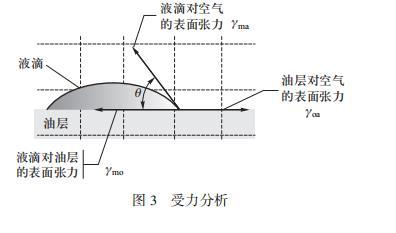 液滴爆炸現(xiàn)象的第二階段邊緣處的液滴產(chǎn)生液滴噴發(fā)現(xiàn)象,在該過(guò)程中液滴中部較厚的部分不斷向邊緣輸送液體,因此會(huì)穩(wěn)定持續(xù)一段時(shí)間。為解釋這一階段,先從表面張力入手,因?yàn)榻佑|角的不同,水對(duì)油的表面張力大于乙醇對(duì)油的表面張力,則混合液體對(duì)油層的界面張力介于水和乙醇之間?;旌弦旱沃幸掖嫉谋壤酱螅旌弦后w對(duì)油層的界面張力越小,受到向內(nèi)的張力減小,這樣整體向外的張力增大,這是產(chǎn)生向外推動(dòng)的驅(qū)動(dòng)力的重要原因??梢?jiàn)界面張力直接決定了液滴在界面上的擴(kuò)散和運(yùn)動(dòng)。