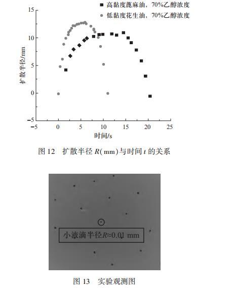 故本文將選擇不同黏度梯度的疏水性物質(zhì)進(jìn)行實(shí)驗(yàn)。采用蓖麻油和花生油進(jìn)行試驗(yàn),蓖麻油的黏度(1452.91 mm2/s)遠(yuǎn)大于花生油(108.34 mm2/s),當(dāng)乙醇濃度為70%時(shí),在蓖麻油上最終液滴的半徑接近0.01 mm,遠(yuǎn)小于對(duì)應(yīng)花生油的測(cè)量值0.0743 mm.分析實(shí)驗(yàn)數(shù)據(jù)得到結(jié)論:微觀上黏度增大會(huì)導(dǎo)致最終形成的液滴減小,宏觀上黏度越大,液滴爆炸總時(shí)間越長(zhǎng),最大擴(kuò)散半徑越小。