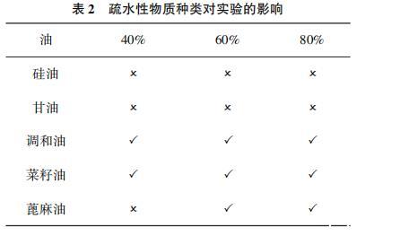表2疏水性物質(zhì)種類對(duì)實(shí)驗(yàn)的影響